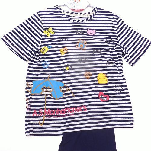 asマンハッタナーズ 半袖半袖パジャマ ルームウェア天竺 ボーダー パジャマ「猫顔プリントシリーズ」 プルオーバー/ワイドパンツ