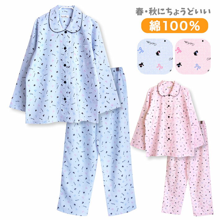 肌にやさしい綿100%天竺ニット地 前開きパジャマ レディース【長袖・長パンツ】【春・初秋向き商品】【Sサイズ】【入院準備】【ルームウェア】猫・ネコ【母の日ギフト】【敬老の日】【動物柄】【女性用パジャマ】【コットン100%】【婦人用ナイトウェア】